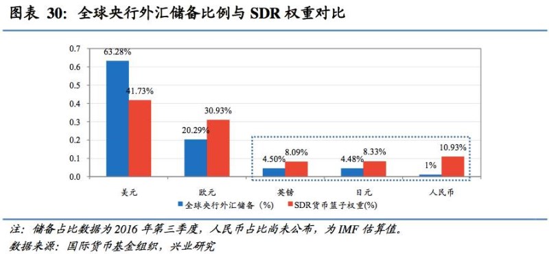 興業(yè)研究今年1月的《人民幣國際化半年報(bào)》中就曾分析到,全球央行對(duì)于人民幣的儲(chǔ)備需求將逐漸增加 。全球SDR總量為1826億,折成美元僅約3000億美元。以人民幣所占SDR份額10.92%的比例進(jìn)行折算,人民幣由SDR作為收支結(jié)算而引起的增配效果大約為2000億人民幣左右。